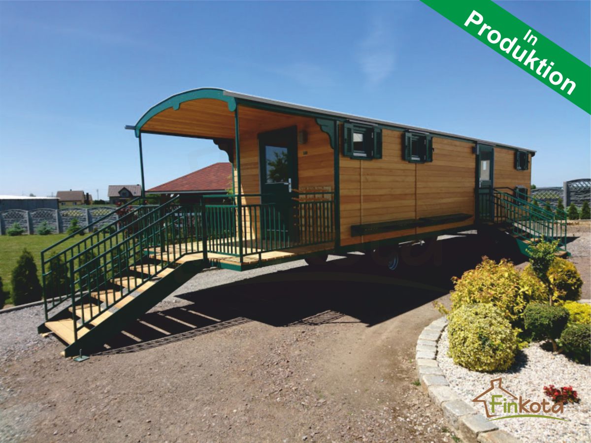 Innenraumlänge: 10 Meter - Terrasse 2 Meter x Wagenbreite (3 Meter), überdacht auf ganzer Tiefe, Aufgang mit beidseitigem Doppelhandlauf und Geländer, sowie rutschsichere Gitterroststufen (abweichend von der Abbildung).
