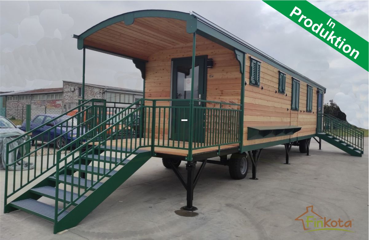 Innenraumlänge: 10 Meter - Terrasse 2 Meter x Wagenbreite (3 Meter), überdacht auf ganzer Tiefe, Aufgang mit beidseitigem Doppelhandlauf und Geländer, sowie rutschsichere Gitterroststufen (abweichend von der Abbildung).
