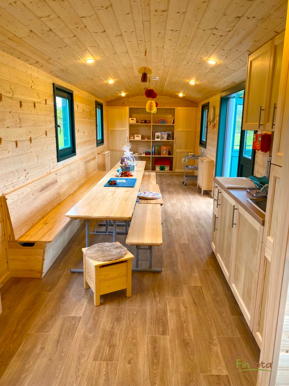 Sie hat einen Wagen geschaffen, in dem unsere Naturkinder bei schlechter Witterung einen tollen Tag drinnen verbringen können. Es ist nicht einfach nur ein Raum, es ist ein wahres Meisterwerk an versteckten Stauräumen, an Platz, an Kuschel- und Rückzugsorten, an Sitz- und Spielmöglichkeiten. Es gibt so viel zu entdecken. Der kleine Raum mit Komposttoilette und Waschbecken sowie einer Möglichkeit zum Wickeln, der separate Garderobenbereich, der riesengroßen überdachten Terrasse. Der Hochebene, dem großzügen Ess- und Spieltisch, der Küchenzeile und noch so vielem mehr.